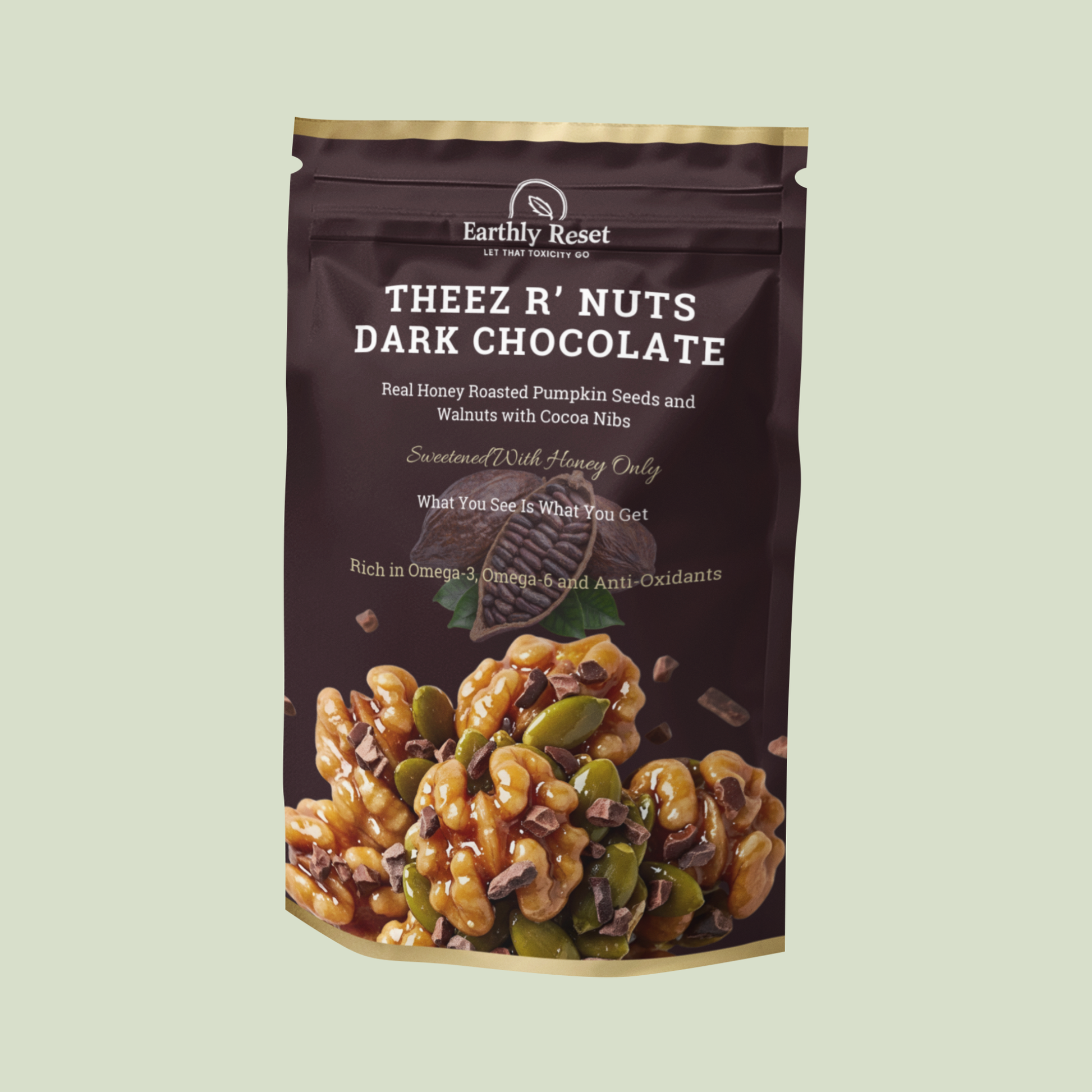 Fuel your body the natural way with The Earthly Reset’s THEEZ R’ NUTS Dark Chocolate Crunch. Made from real honey-roasted pumpkin seeds and walnuts, this wholesome blend delivers clean energy and rich nutrition in every bite. Balanced with 100% unsweetened cocoa nibs and roasted in organic coconut oil, this guilt-free treat satisfies your cravings while nourishing your body with powerful antioxidants and healthy fats.